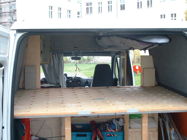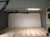 Der ehemals dort befindliche Kleiderschrank fehlt uns nicht sonderlich und es entsteht ein sehr gutes Raumgefühl durch den gewonnenen Platz. Für einen Kastenwagen sehr geräumig. |