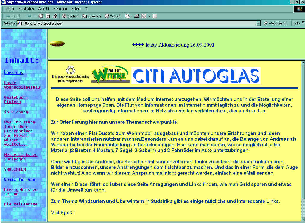 http://mitglied.lycos.de/atappi/default.htm Seite ist leider abgeschaltet! Dann habe ich erst mal am Wohnmobil gebaut und wollte Bilder und Erfahrungen natürlich auf eine neue Homepage bringen. Die heutigen Editoren für Web- Seiten erlauben eigentlich, wie jede andere Anwendung auch, alles Menügesteuert zu entwerfen. Meine Erfahrungen sagen mir, dass es immer dann kompliziert wird, wenn etwas nicht so wird, wie es werden soll. Selbst mit Wysiwyg- Editor ( What you see is what you get) zu deutsch= Du siehst, was Du gerade gemacht hast, sehen Seiten dann im Netz ganz anders aus als gewollt. Das ist dann der Punkt, wo ich versuche, meine alten html- Kenntnisse zu nutzen